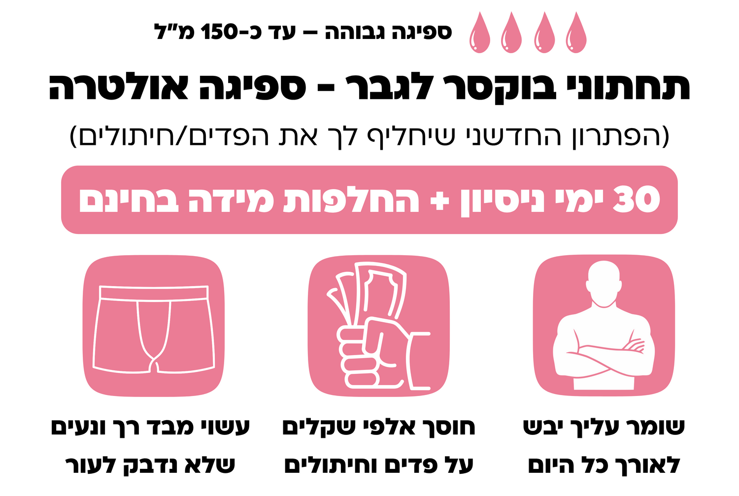 - התחתונים שלנו נראים ומרגישים בדיוק כמו תחתונים רגילים – רק שהם 100% סופגים!